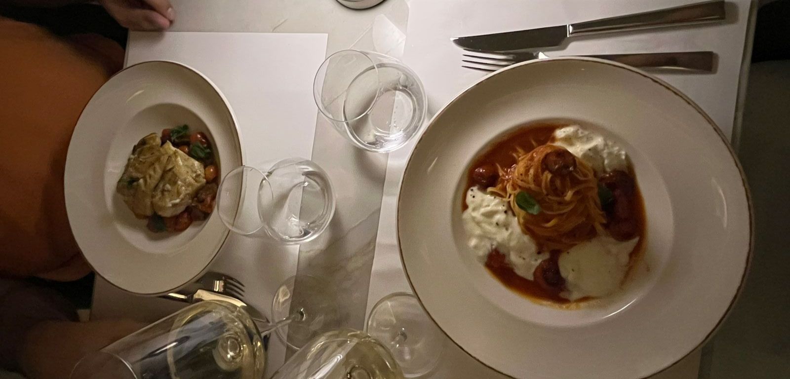🐟 En los principales nos decidimos por la pesca blanca (chernia, tomates cherry, olivas negras y alcaparras), los spaghetti pomodoro, la pasta Isola (linguini nero, frutos de mar y bisque) y el raviolón de ternera (carrillera braseada, demi-glace, marsala, avellanas, panceta, parmesano y aceite de trufa). Acompañado por vino blanco y tinto.