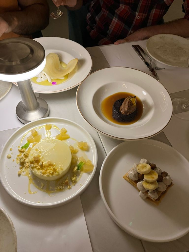 🍋 Para cerrar, junto con el café, cuatro postres que no podían estar mejores: un bizcocho húmedo de chocolate con salsa de caramelo salado y mousse de chocolate; una pannacotta con peras al caramelo y frola de oliva y romero; una mousse de banana con masa cannoli frita y dulce de leche; y un lemon curd (tuile, curd de limón, merengue, helado de limón y menta).
