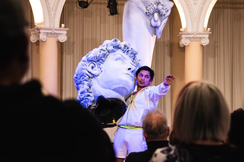 David, el marrón, se enamora de Juan en la tetera (espacio público utilizado para el encuentro sexual entre varones) de un museo de la Ciudad de Buenos Aires. Entre esculturas europeas, obras de arte argentino y mingitorios, se miran, se besan, se prometen matrimonio. David, el de Miguel Ángel, tan gélido él, es primero testigo involuntario de ese amor, para luego ser, por qué no, su verdugo. La obra de David Gudiño con dirección de Laura Fernández cuenta las vicisitudes y el trágico desenlace de un extraño triángulo amoroso interracial –el de Juan, el rubio; David, el marrón y David, el de mármol–, mientras cuestiona las nociones de belleza, bondad y pureza históricamente otorgadas a la blanquitud.